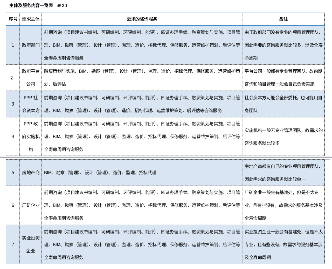不同的投資主體對全過程咨詢需求的服務內(nèi)容是不一樣的,一是因為投資主體本身性質(zhì)的不同,法律法規(guī)所規(guī)定的也不一樣,二是投資主體自身團隊管理水平的因素所需求的咨詢服務也不一樣,以下通過表格列述不同的主體所需求的咨詢服務:
