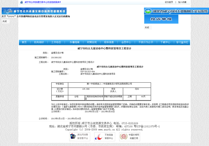 咸寧市婦女兒童活動(dòng)中心暨科技館項(xiàng)目工程設(shè)計(jì)中標(biāo)通知
