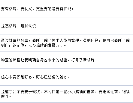 聽完鐘董的分享,鼎正工程咨詢股份有限公司董事長王雁然對此次中量鼎正EMBA的聯(lián)合開辦表示祝賀。他表示,鐘董的分享充滿激勵與鼓勵,希望學(xué)員們能夠從中學(xué)習(xí)積極追求的樂觀心態(tài),在這寶貴的一天里,主動思考、互動,在有限的時(shí)間內(nèi),創(chuàng)造無限的學(xué)習(xí)價(jià)值。