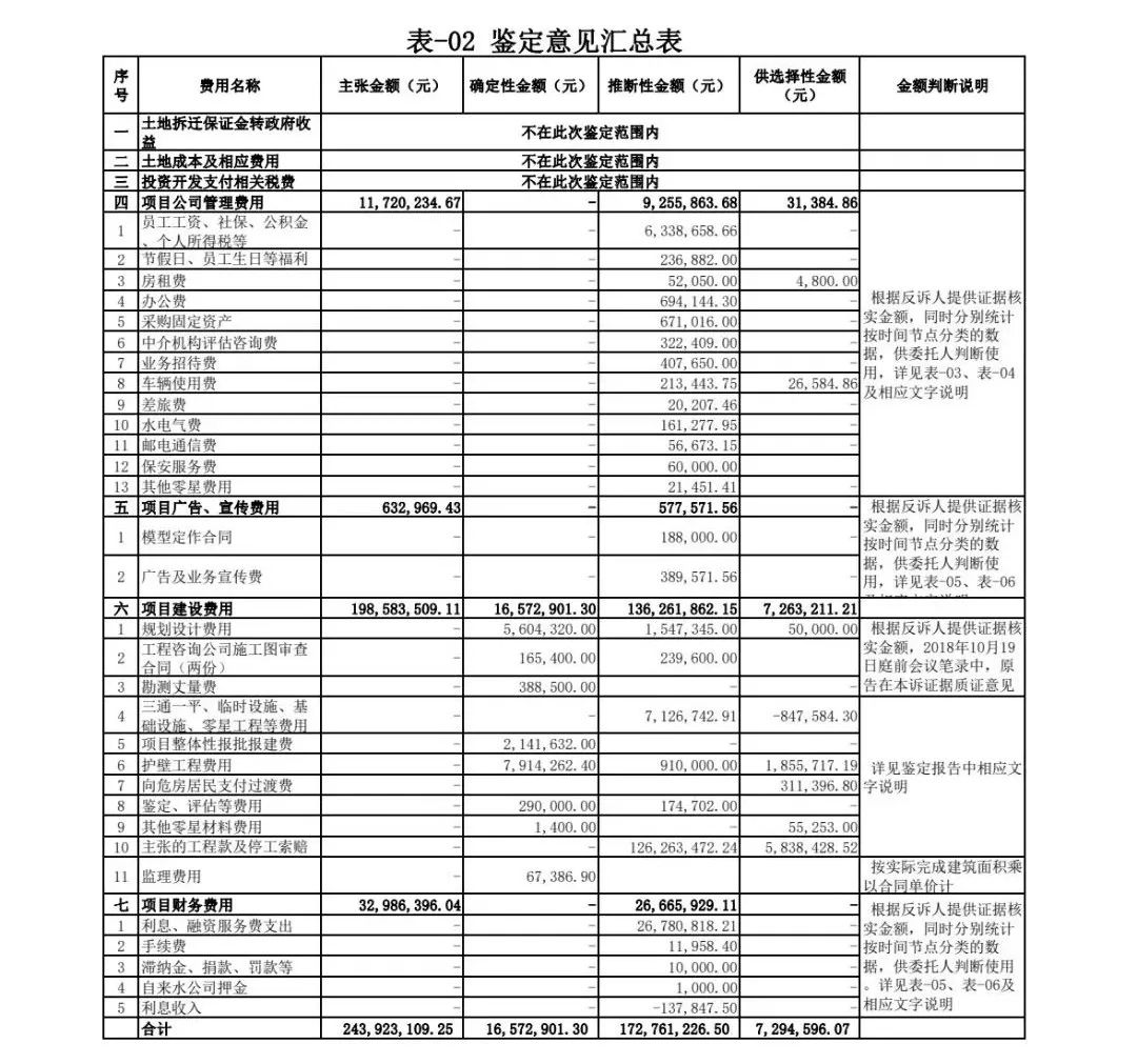 由于本項(xiàng)目涉及費(fèi)用項(xiàng)目、金額均較大,《鑒定意見書》中分別根據(jù)證據(jù)情況、國家文件規(guī)定、解除合同時間等分類方式,逐項(xiàng)對金額進(jìn)行了分類,并附加相關(guān)說明,為法庭判決提供了數(shù)據(jù)支撐。最終鑒定確定性金額16,572,901.30元,推斷性金額172,761,226.50 元,供選擇性金額7,294,596.07 元,具體詳表-02