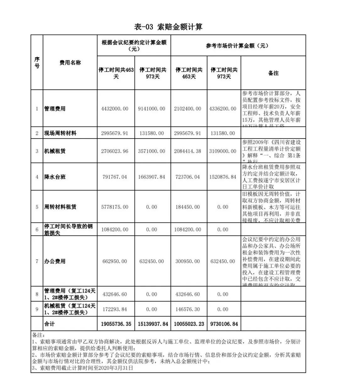 政府與開發(fā)公司之間的合同已解除,但鑒定時,開發(fā)公司與施工單位之間簽訂的施工合同并未解除。項(xiàng)目公司管理費(fèi)的時間節(jié)點(diǎn)判定就成了一個難題。鑒定人經(jīng)多次內(nèi)部討論,最終確定:將項(xiàng)目公司管理費(fèi)列為推斷性金額,且根據(jù)不同方案分別統(tǒng)計金額,提交法院參考(具體數(shù)據(jù)詳表-03):