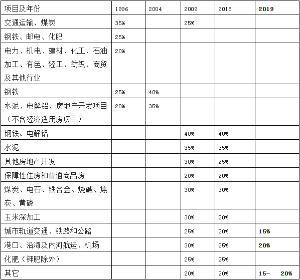 國發(fā)〔1996)35號規(guī)定了項目資本金占總投資最低比例,后續(xù)年份多次發(fā)文調整,具體整理如下: