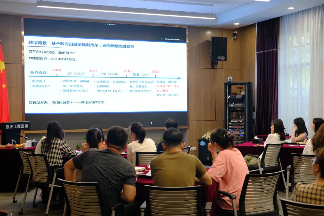 在兩個小時的分享中,楊總從政府投融資平臺公司的前世今生,系統(tǒng)介紹了政府投融資體制改革背景、政府投融平臺公司轉(zhuǎn)型發(fā)展思路、工程咨詢企業(yè)與政府投融平臺公司合作模式。
