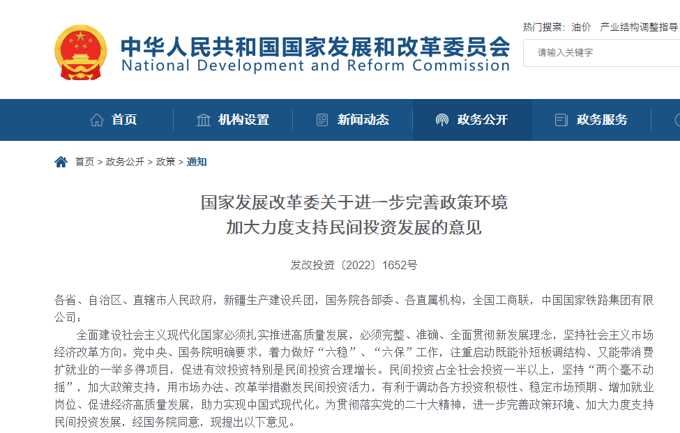 全面建設社會主義現(xiàn)代化國家必須扎實推進高質量發(fā)展,必須完整、準確、全面貫徹新發(fā)展理念,堅持社會主義市場經濟改革方向。黨中央、國務院明確要求,著力做好“六穩(wěn)”、“六?!惫ぷ?,注重啟動既能補短板調結構、又能帶消費擴就業(yè)的一舉多得項目,促進有效投資特別是民間投資合理增長。民間投資占全社會投資一半以上,堅持“兩個毫不動搖”,加大政策支持,用市場辦法、改革舉措激發(fā)民間投資活力,有利于調動各方投資積極性、穩(wěn)定市場預期、增加就業(yè)崗位、促進經濟高質量發(fā)展,助力實現(xiàn)中國式現(xiàn)代化。為貫徹落實黨的二十大精神,進一步完善政策環(huán)境、加大力度支持民間投資發(fā)展,經國務院同意,現(xiàn)提出以下意見。
