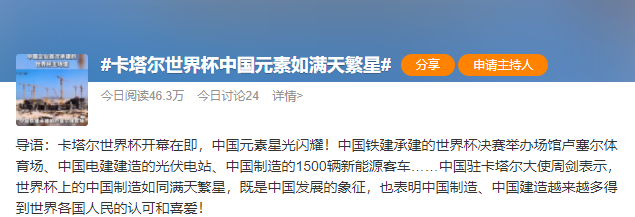 11月20日,2022年卡塔爾世界杯正式開幕。開幕式當(dāng)天,中國外交部發(fā)言人華春瑩在推特上連發(fā)8條推文,以圖文并茂的方式介紹世界杯“隨處可見的中國元素”。這也讓“卡塔爾世界杯中國元素如滿天繁星”的話題登上熱搜。