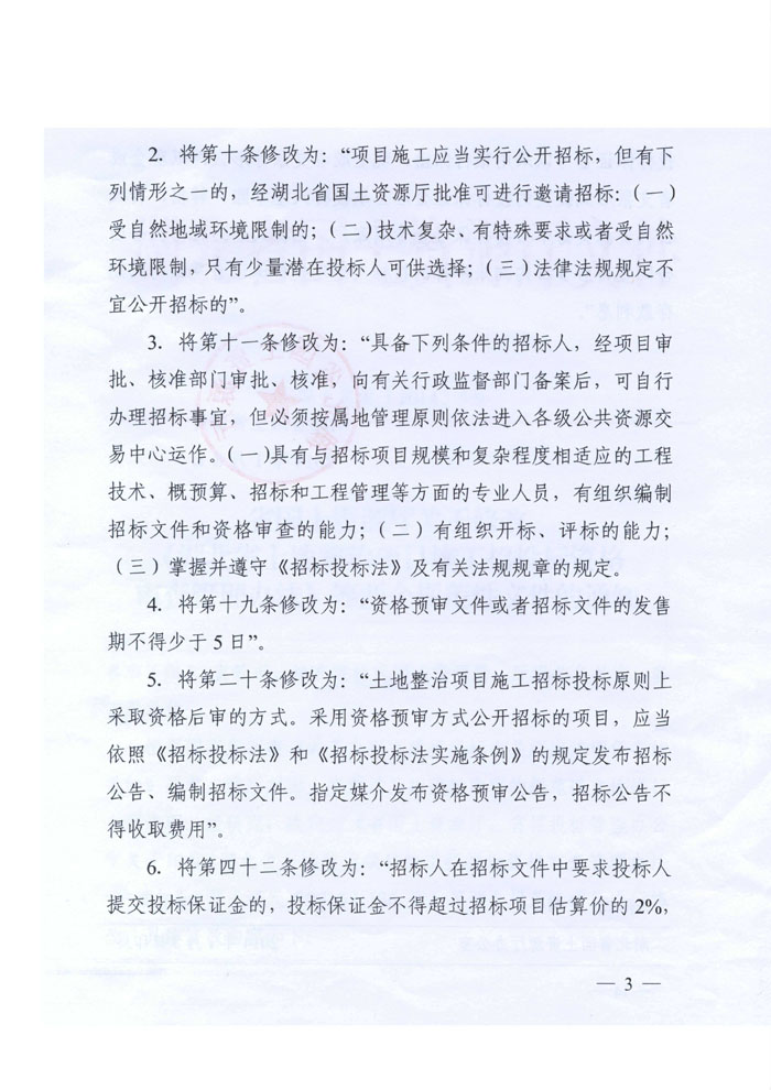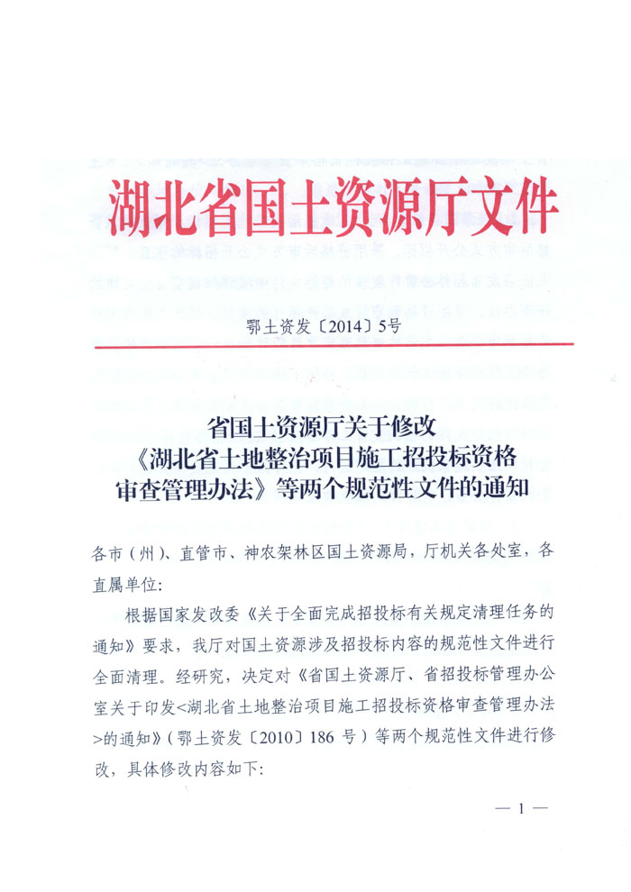 湖北省國(guó)土資源廳關(guān)于修改《湖北省土地整治項(xiàng)目施工招投標(biāo)資格審查辦法》等兩個(gè)規(guī)范性文件的通知
