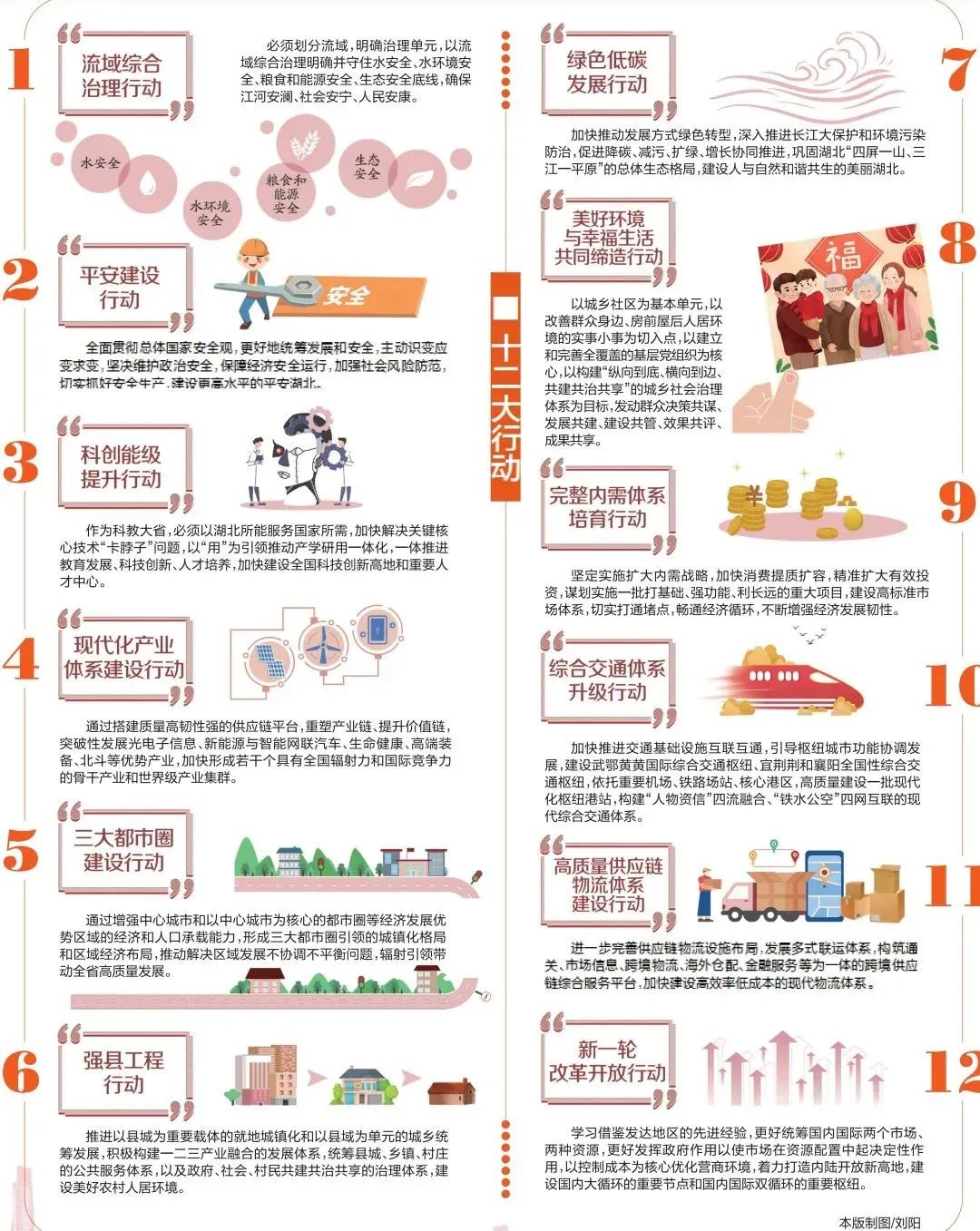 4月18日,湖北省政府新聞辦召開《關于加快建設全國構建新發(fā)展格局先行區(qū)的實施意見》(以下簡稱《實施意見》)精神解讀系列新聞發(fā)布會第一場?!秾嵤┮庖姟饭卜秩蟛糠趾透郊?。第一部分是總體要求,主要闡述文件起草的指導思想、總體思路、基本原則、主要目標;第二部分是主體,圍繞統(tǒng)籌發(fā)展和安全、統(tǒng)籌城鄉(xiāng)區(qū)域和資源環(huán)境、統(tǒng)籌國內國際兩個市場兩種資源,部署“十二大行動”(具體內容見下圖);第三部分從組織領導、完善配套政策、加強考核評估等方面強調了推進實施的保障措施。附件為加快建設全國構建新發(fā)展格局先行區(qū)的主要指標,設定了71項數(shù)據(jù)指標。