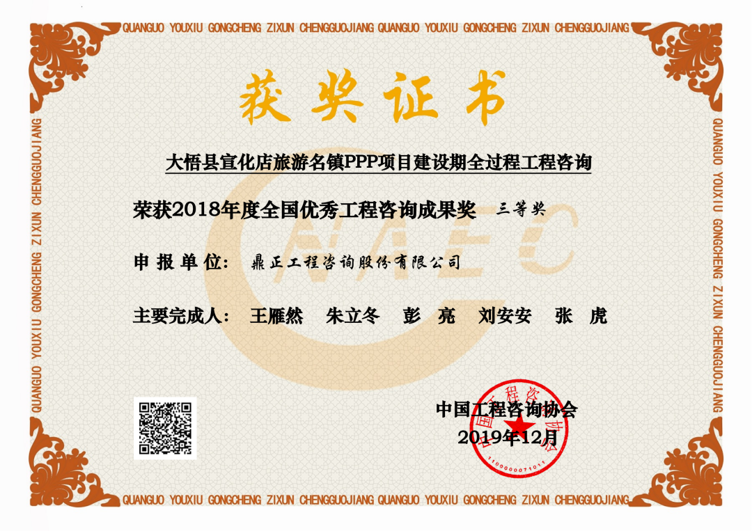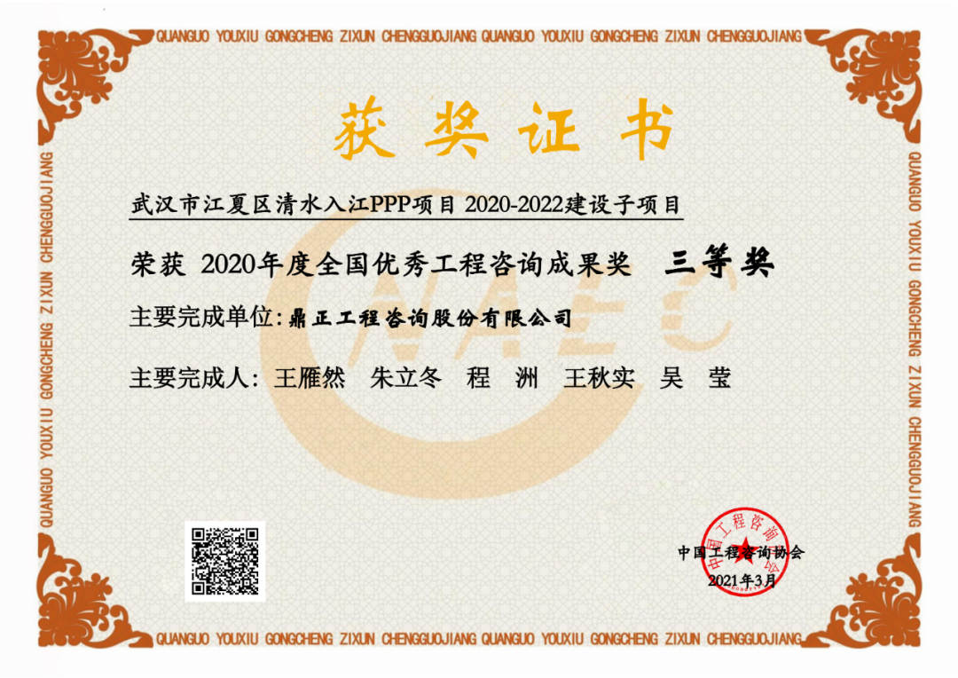 每兩年評選一次,2018-2019年,我司大悟縣宣化店旅游名鎮(zhèn)建設(shè)PPP項(xiàng)目首獲“全國優(yōu)秀工程咨詢成果獎”榮譽(yù);2020-2021年,我司武漢市江夏區(qū)清水入江PPP項(xiàng)目再獲該獎;2022-2023年,我司東數(shù)西算貴安新區(qū)算力立業(yè)集群配套項(xiàng)目第三次獲得此殊榮