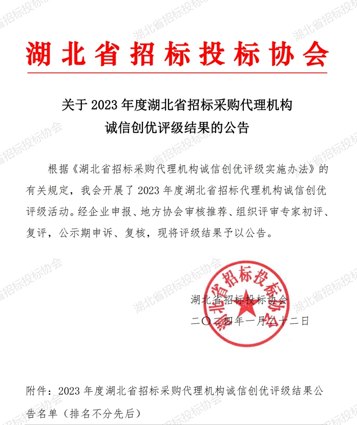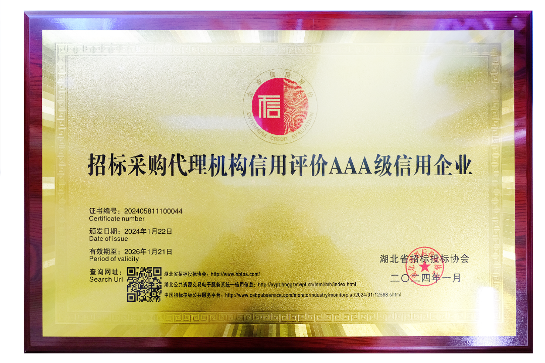 近日,鼎正憑借誠信的經(jīng)營理念、良好的企業(yè)信譽和優(yōu)質(zhì)的服務質(zhì)量,榮獲由湖北省招標投標協(xié)會認定的最高等級“招標采購代理機構(gòu)信用評價AAA級信用企業(yè)”稱號。