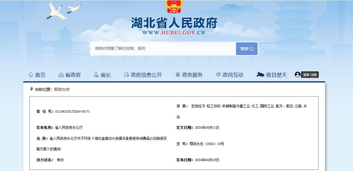 《湖北省推動(dòng)大規(guī)模設(shè)備更新和消費(fèi)品以舊換新實(shí)施方案》已經(jīng)省人民政府同意,現(xiàn)印發(fā)給你們,請(qǐng)認(rèn)真貫徹落實(shí)。2024年4月11日