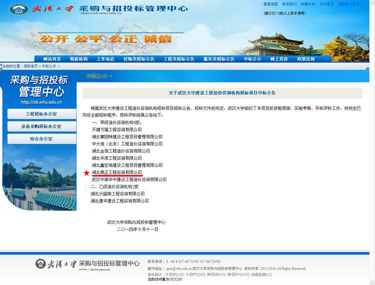 我公司入圍武漢大學(xué)建設(shè)工程造價咨詢機(jī)構(gòu)信息庫,此次遴選面向全國工程造價咨詢企業(yè)進(jìn)行招標(biāo),共入圍10家企業(yè),主要為武漢大學(xué)提供建設(shè)工程項目工程量清單與招標(biāo)控制價編制與審核、全過程造價控制、竣工結(jié)算審核等相關(guān)服務(wù)。