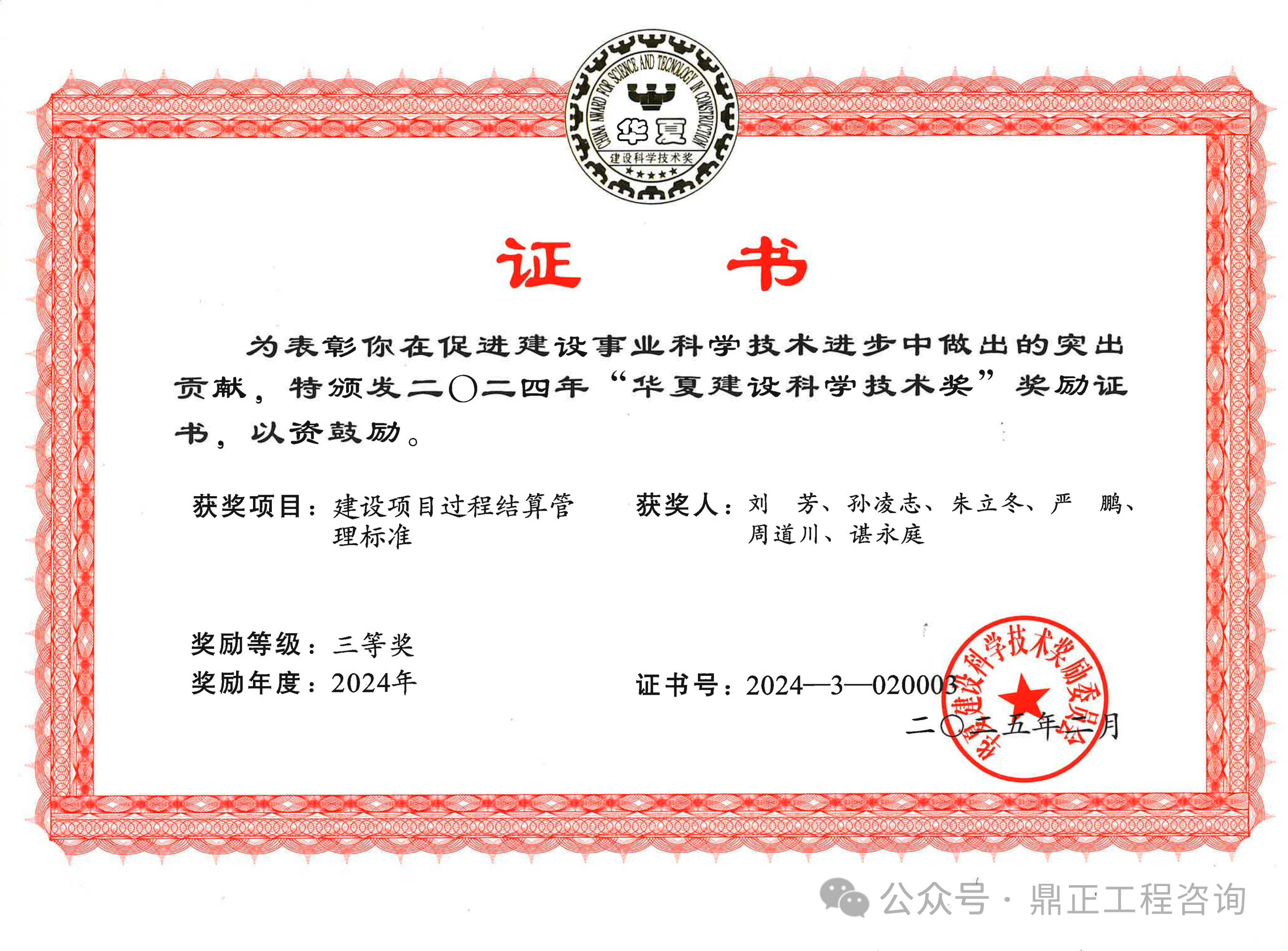 鼎正參與編制的《建設(shè)項(xiàng)目過程結(jié)算管理標(biāo)準(zhǔn)》(T/CECS 1178-2022)通過專業(yè)組和評(píng)審委員會(huì)的兩級(jí)評(píng)審,從700余個(gè)報(bào)送項(xiàng)目中脫穎而出,榮獲2024年度華夏建設(shè)科學(xué)技術(shù)獎(jiǎng)三等獎(jiǎng)。