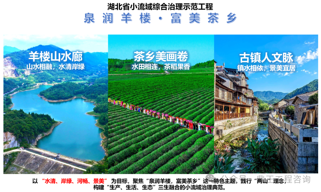 以本項(xiàng)目為例,設(shè)計(jì)提出以 “水清、岸綠、河暢、景美” 為目標(biāo),聚焦“泉潤(rùn)羊樓,富美茶鄉(xiāng)”這一特色主題,踐行“兩山”理念,構(gòu)建“生產(chǎn)、生活、生態(tài)”三生融合的小流域治理典范。