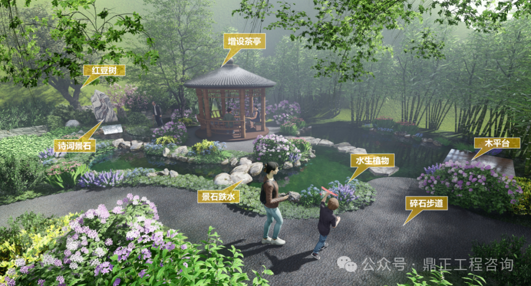 水景觀水文化打造:通過深挖相公泉?dú)v史文化內(nèi)涵,進(jìn)行本地印象提煉?!跋喙币辉~在古代,是妻子對(duì)丈夫的稱呼,也是君子、生員(秀才、相公)、宰相的另一種叫法。君子愛茶,沏茶品茗,修煉品性,以茶可雅志,茶是象征著塵世的純潔。設(shè)計(jì)從自然山水出發(fā),落位于閑情逸致設(shè)計(jì)基調(diào),泉眼處采用題字景石配上一棵姿態(tài)旖旎的紅豆,視線端頭一幅竹影錦鯉、花木跌水的畫面映入眼簾,兩側(cè)的樹木林立,開合有致,整個(gè)節(jié)點(diǎn)的中心是一座圓頂茶亭,在亭中,一壺清茶問道,仿佛拉近了古今往事,也增加了場(chǎng)地的記憶,呈現(xiàn)出 “千年古樹頻招手,萬年清泉溢清香”的意境。