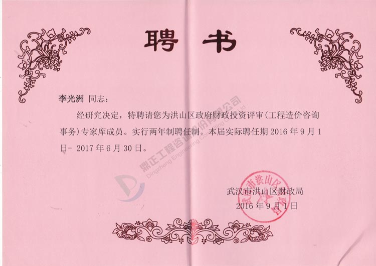 我司李光洲同志被武漢市洪山區(qū)財(cái)政局特聘為洪山區(qū)政府財(cái)政投資評(píng)審(工程造價(jià)咨詢事務(wù))專家